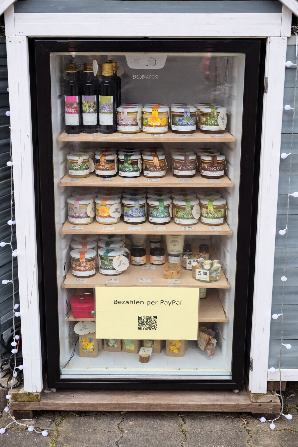 Wir verkaufen unsere Produkte in unserem Hauskiosk in unserer Hofeinfahrt: